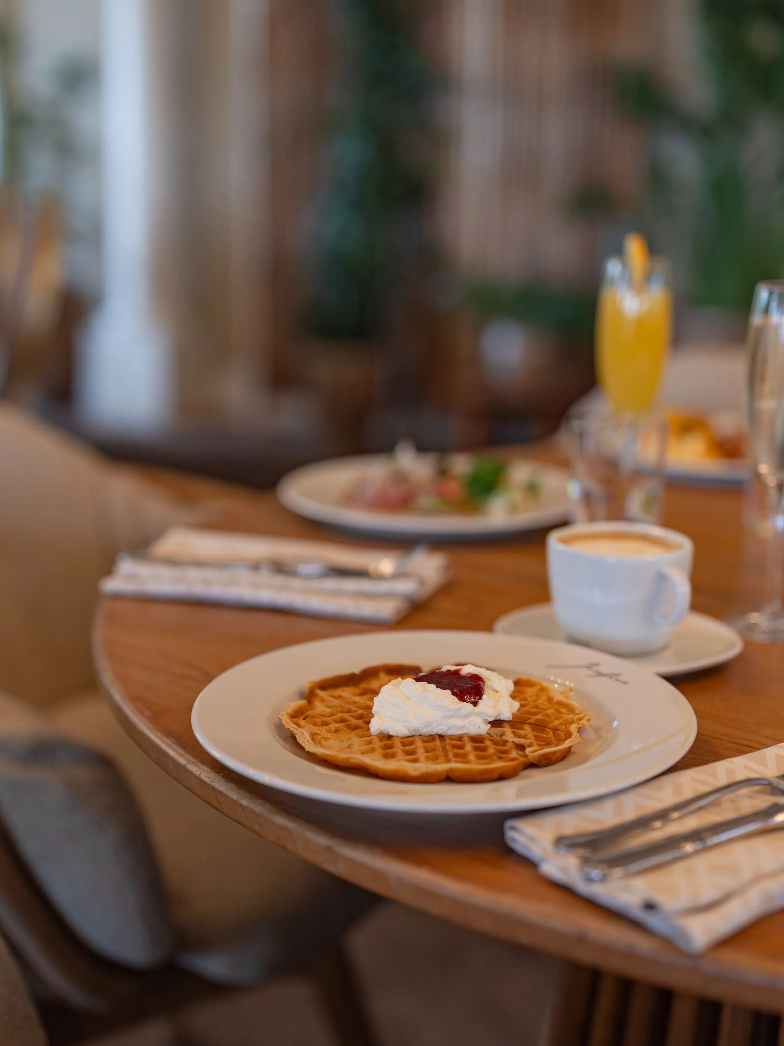 To finish, our indulgent dessert table awaits – featuring freshly made waffles, creamy mousses, fresh berries, and delicate French pastries with chocolate and almond (the kind that melt in your mouth).
